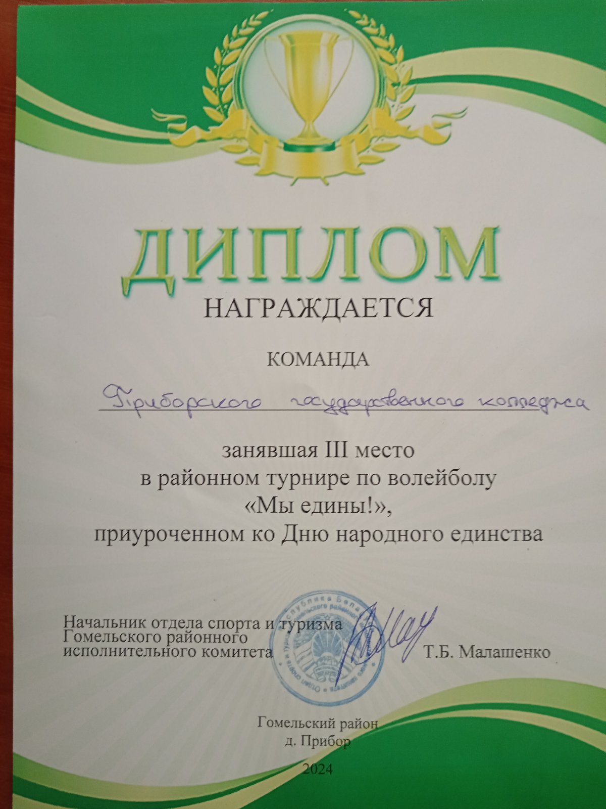 12.09.2024 в колледже прошёл районный турнир по волейболу «Мы едины», приуроченный ко Дню народного единства, команда учащихся колледжа заняли почётное 3 место.