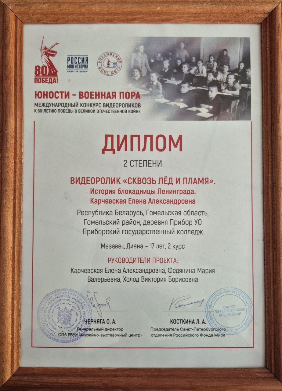 УО «Приборский государственный колледж» принял участие в международном культурно-просветительском проекте «Юности — военная пора» Санкт-Петербургского отделения Международного общественного фонда «Росийский Фонд Мира» совместно с Санкт-Петербургским государственным бюджетным учреждением культуры «Музейно-выставочный центр», приуроченом 80-ти летию Победы в Великой Отечественной Войне.