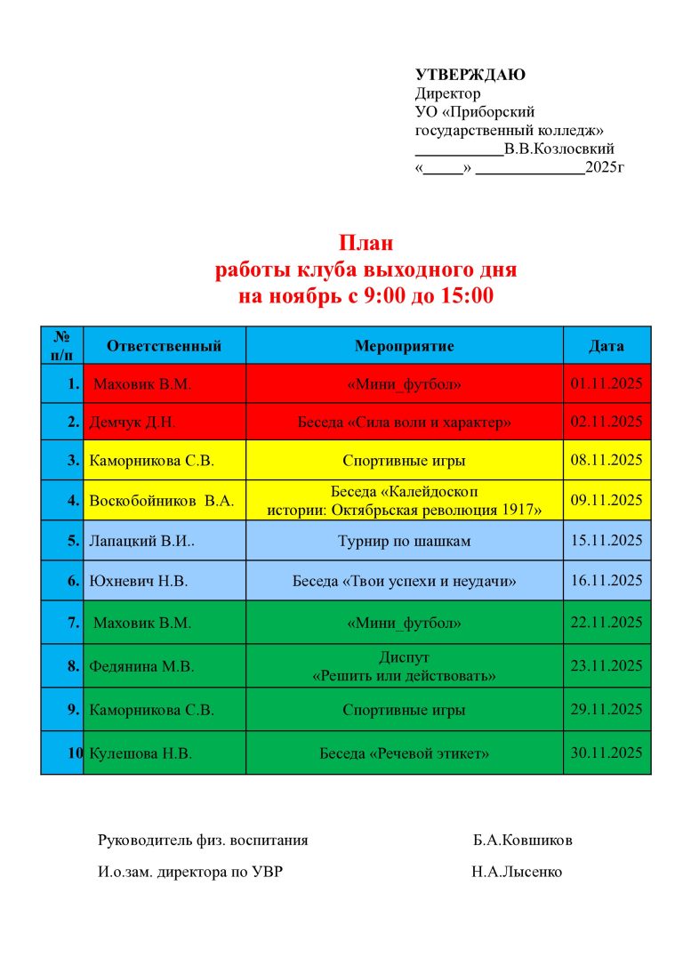 План работы Клуба выходного дня